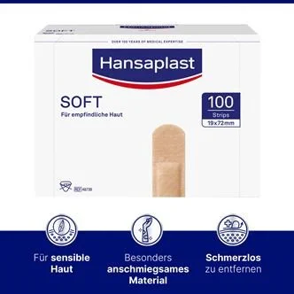 Hansaplast Soft ist ein besonders hautfreundlicher, luft- und wasserdampfdurchlässiger Wundschnellverband für die empfindliche Haut. Hansaplast Soft besteht aus hypoallergenem Material, die Hautverträglichkeit ist dermatologisch bestätigt.