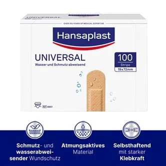 Hansaplast Universal besteht aus wasser- und schmutzabweisendem, aber gleichzeitig hautfreundlichem, atmungsaktivem Material und ist zur Versorgung kleiner Verletzungen geeignet, besonders wenn Verletzungen Schmutz und Feuchtigkeit ausgesetzt sind.