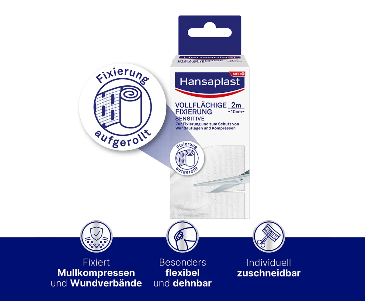 Mit Hansaplast Vollflächige Fixierung können Wundauflagen oder Kompressen einfach und sicher fixiert werden, um Wunden vor Bakterien und Schmutz zu schützen. Das Trägermaterial besteht aus einem weichen, flexiblen Vlies und bietet angenehmen Tragekomfort, besonders bei der Wundversorgung von größeren Körperflächen am Rücken und Bauch oder an Gelenken.