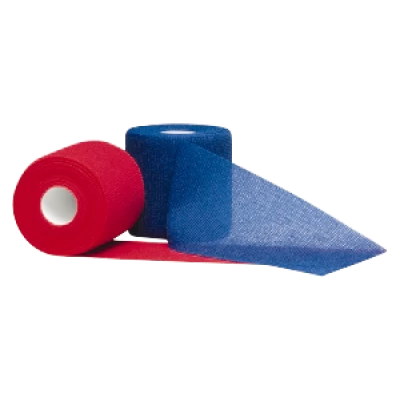 Farbige, kräftige, kohäsive Fixierbinde | Aus 40 % Baumwolle, 30 % Viskose, 30 % Polyamid | Klebemasse: Latexfreies synthetisches Polymer | Latexfrei | Längselastisch und hautfreundlich | Auf sich selbst haftend, rutschfest und schnittkantig | Dehnbarkeit: ca. 105 % | Länge: 20 m